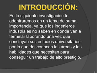 Este documento resume las principales conclusiones de una investigación sobre las áreas y habilidades necesarias para que los ingenieros industriales tengan éxito en el mercado laboral. La investigación encontró que los ingenieros industriales pueden desempeñarse en alrededor de 20 puestos diferentes y que la edad promedio es entre 30-34 años. También determinó que es importante que posean habilidades amplias para poder adaptarse a diferentes campos laborales como diseño, producción, manufactura, administración y más.