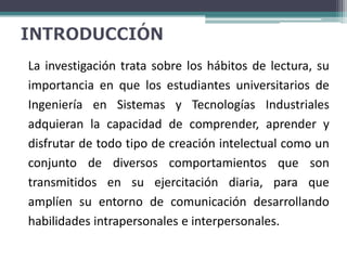 La investigación analiza el desinterés de los estudiantes de Ingeniería en Sistemas y Tecnologías Industriales de la Universidad Politécnica de San Luis Potosí por leer libros. Busca identificar los factores que causan esta falta de interés y reconocer cómo la lectura beneficia su formación profesional. Se aplicarán encuestas y entrevistas para analizar los hábitos lectores de los estudiantes e identificar estrategias que puedan fomentar más el hábito de la lectura.