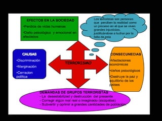 El documento describe el terrorismo en Medio Oriente, definiendo el terrorismo como violencia indiscriminada que causa sufrimiento para atraer atención. Propone que para reducir los actos terroristas se deben crear nuevos tratados de paz estrictos, resolver problemas sociales y culturales, y lograr acuerdos de ayuda mutua entre países.