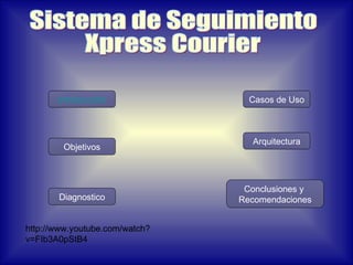 El documento presenta un sistema de seguimiento para una empresa de envío de paquetería llamada Xpress Courier. Los objetivos del sistema son permitir que los clientes puedan ver la ubicación de sus paquetes, conocer los procesos internos de la empresa, y mejorar los procesos de envío, transporte, pago y entrega. El documento también describe las falencias actuales de las empresas de envío como falta de control y seguimiento, e informa sobre la arquitectura propuesta del sistema que utilizará una base de datos, servicios web y tres capas.