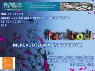 La investigación analiza la importancia de la mercadotecnia en Facebook para los usuarios juveniles. Busca demostrar el impacto de la publicidad en Facebook al ser la red más usada por los jóvenes, e identificar los productos más vendidos y publicitados. Se realizaron encuestas y entrevistas que mostraron que los jóvenes pasan varias horas diarias en Facebook y son influenciados por la publicidad, comprando en su mayoría tecnología, ropa y música. También se ofrecen diversos servicios. La investigación concluye que Facebook es