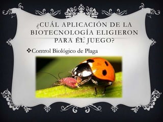 Este documento presenta un resumen de un juego desarrollado por dos estudiantes utilizando el programa Alice 2.2 de la Universidad de Carnegie Mellon. El juego explora la aplicación del control biológico de plagas en la agricultura como una opción ambientalmente amigable para combatir amenazas a los cultivos. Los estudiantes encontraron que lo más difícil fue programar las variables y movimientos del personaje del juego, pero que pudieron resolverlo implementándolo en etapas.