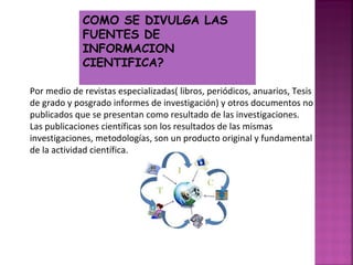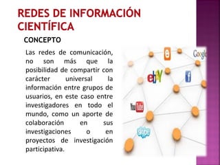 El documento describe las redes de información científica y cómo han contribuido a acercar a los investigadores a través de plataformas como sitios de redes sociales. Estas redes permiten compartir información, publicar resultados de investigación, y conectar a los científicos con sus pares de manera más efectiva.