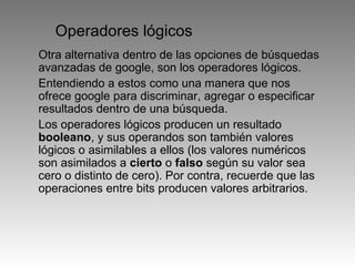 El documento habla sobre diferentes temas relacionados con la búsqueda de información en Internet, incluyendo operadores lógicos en Google, filtros de búsqueda avanzada, metabuscadores, bases de datos institucionales, Google Books, Google Académico, Google News, Archive.org, PageRank y el protocolo WHOIS. Explica conceptos como Intranet, dominios genéricos y diferentes servicios de Google para buscar información en la web de manera efectiva.