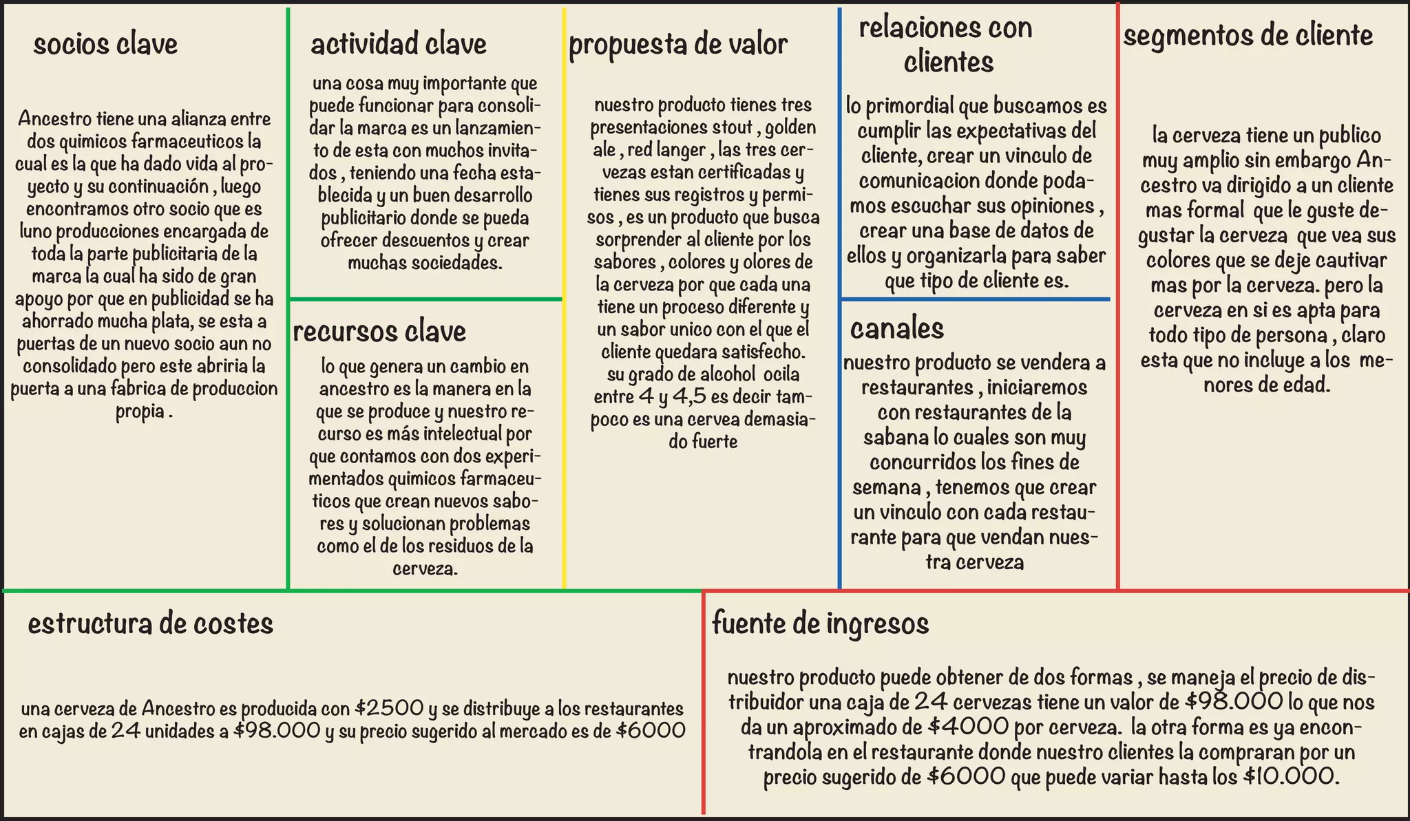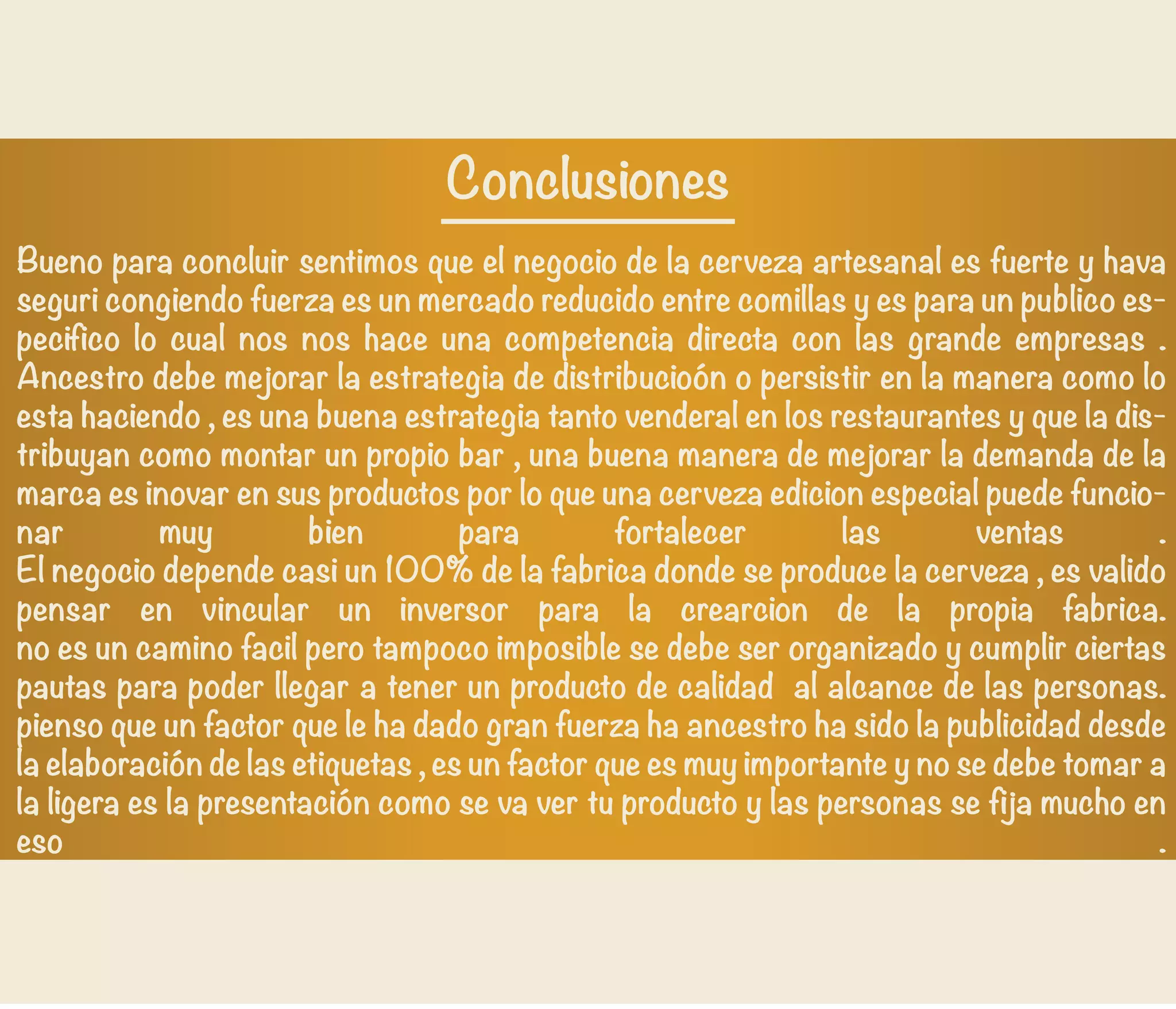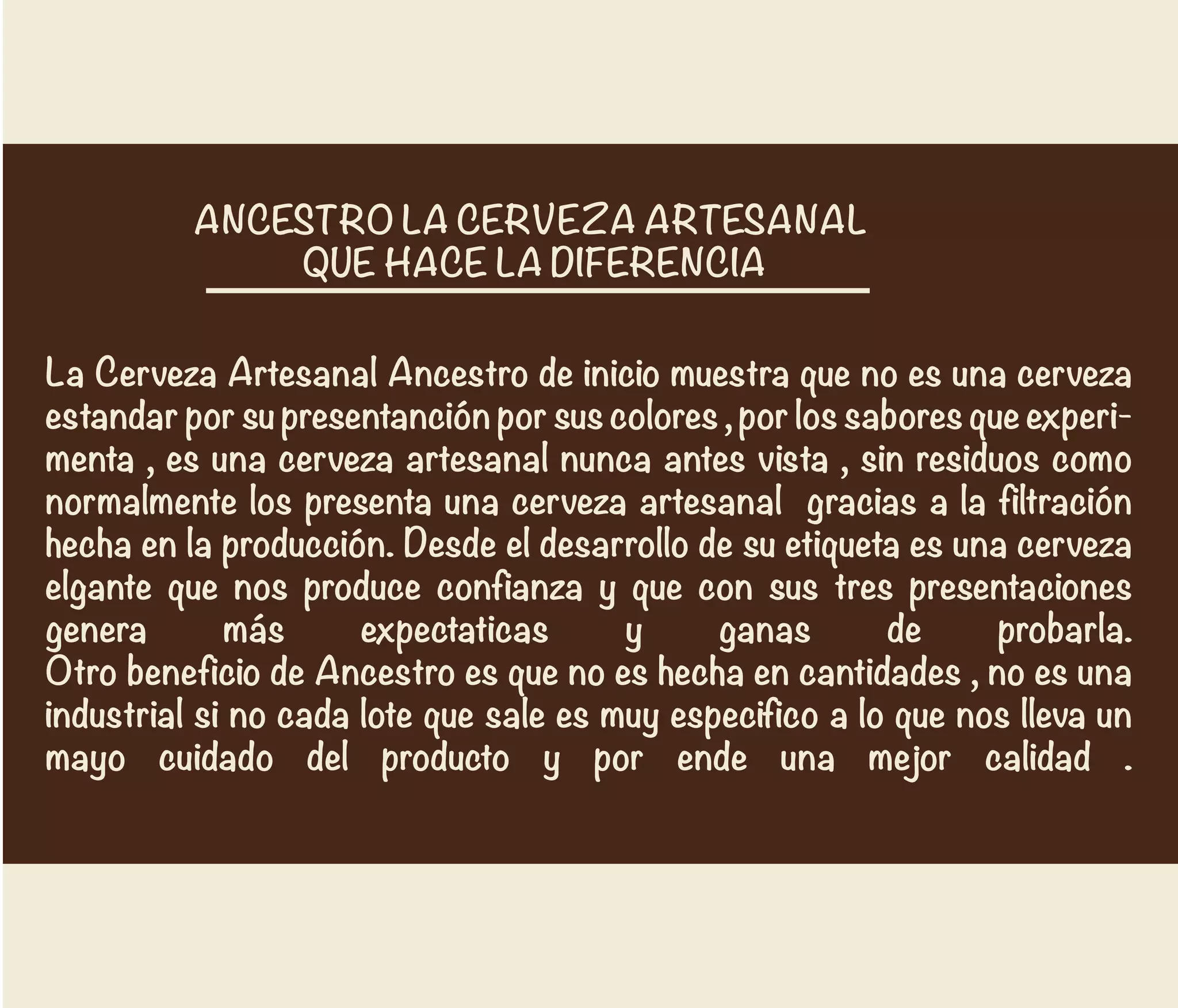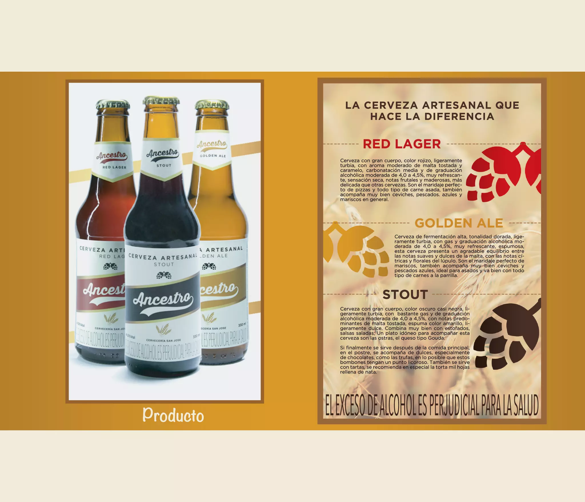 La empresa Ancestro planea entrar al mercado de cerveza artesanal con tres tipos de cerveza - una rubia, una roja y una negra - para combinar con comidas en restaurantes frecuentados por clientes de clase media alta. Un cliente entrevistado, el trader Diego Cano de BBVA, probó la cerveza y dijo que cumplió y superó sus expectativas, como se muestra en un video de su entrevista.