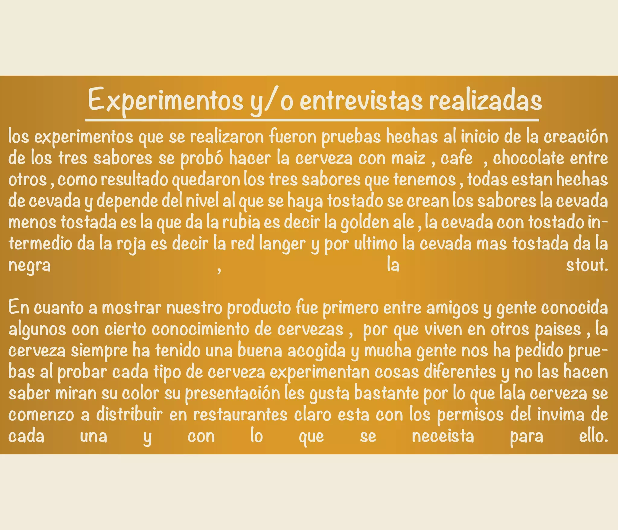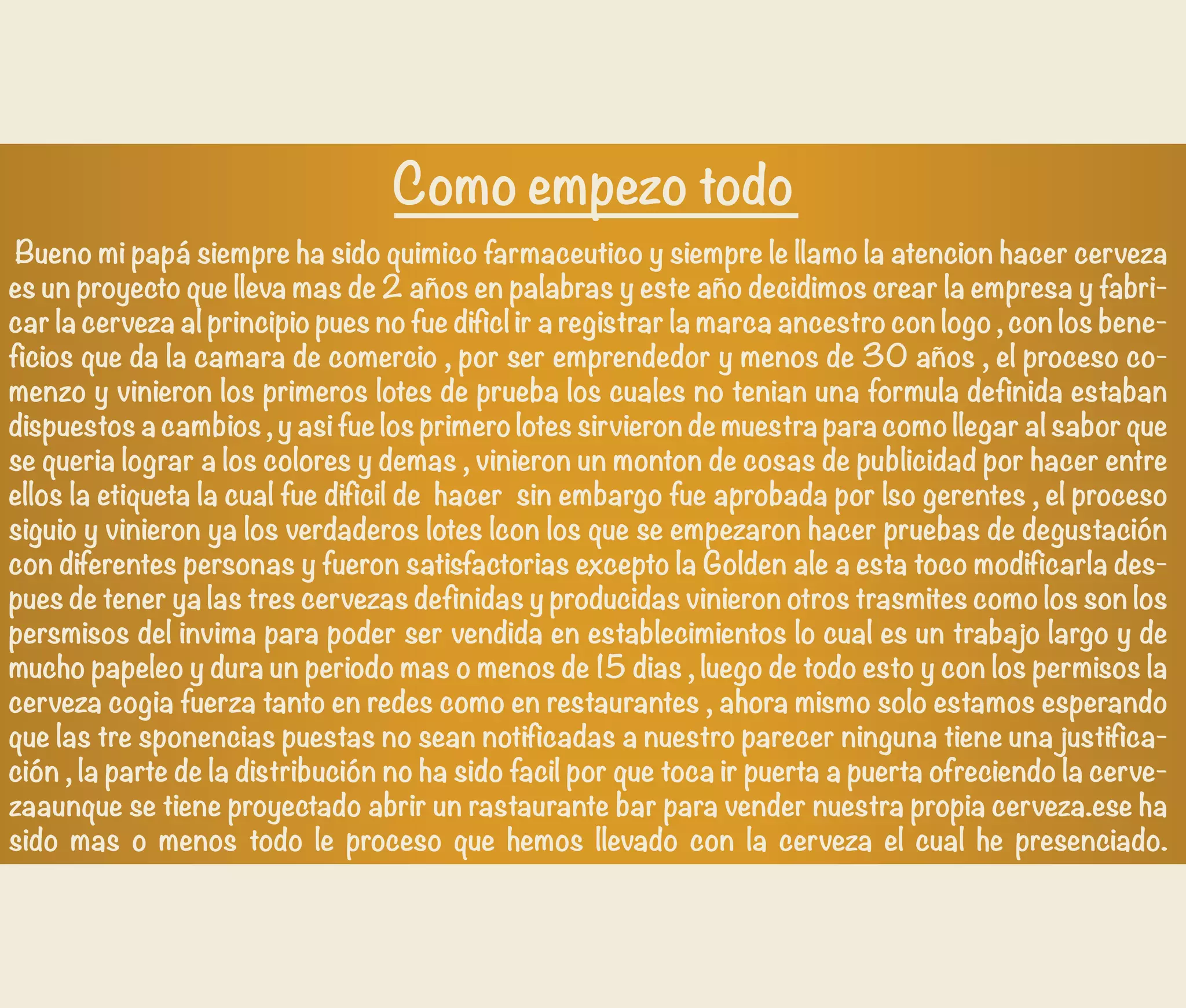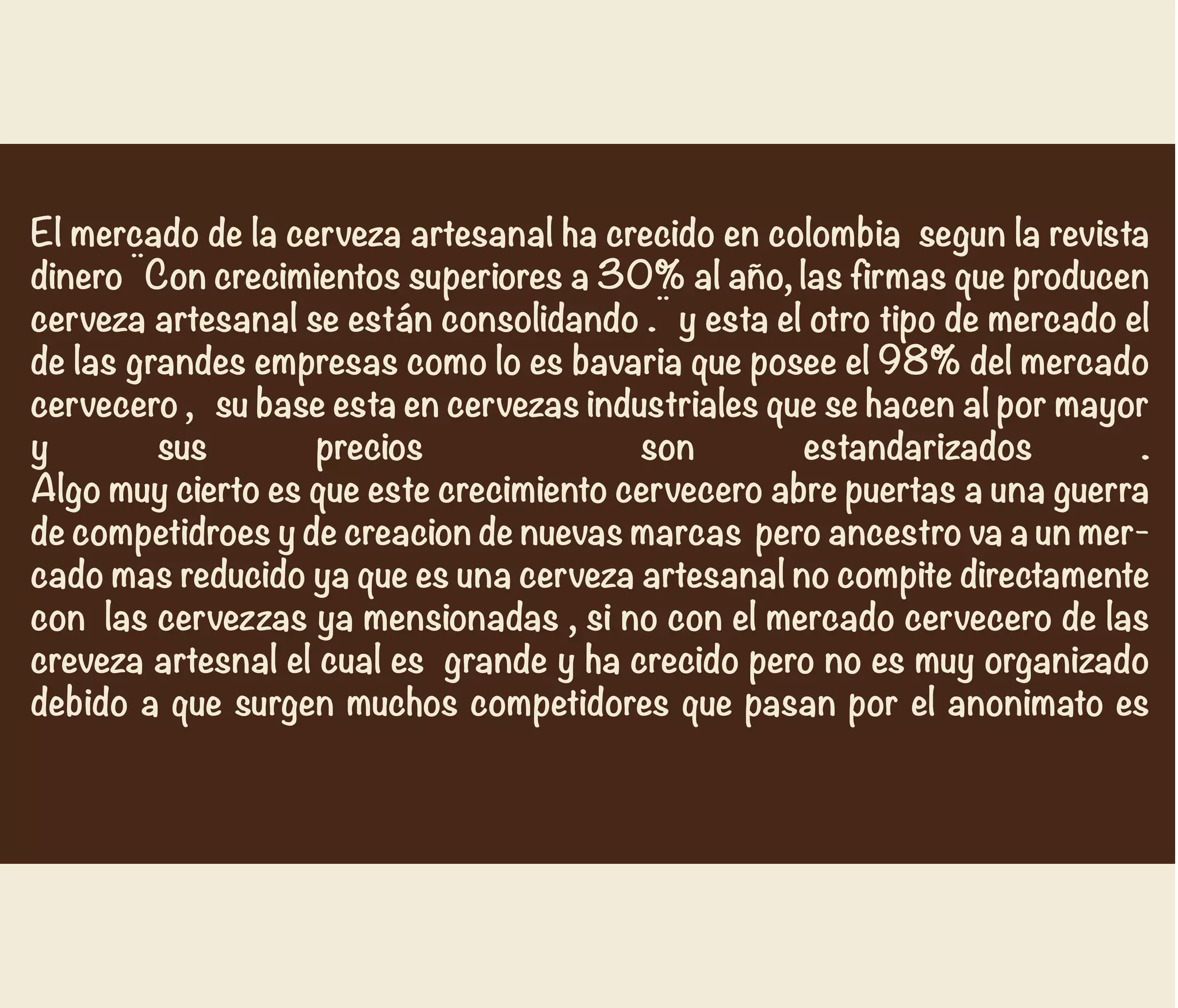 La empresa Ancestro planea entrar al mercado de cerveza artesanal con tres tipos de cerveza - una rubia, una roja y una negra - para combinar con comidas en restaurantes frecuentados por clientes de clase media alta. Un cliente entrevistado, el trader Diego Cano de BBVA, probó la cerveza y dijo que cumplió y superó sus expectativas, como se muestra en un video de su entrevista.