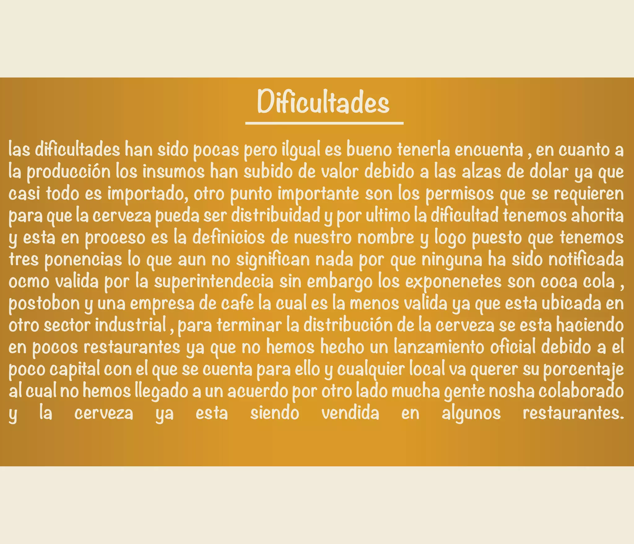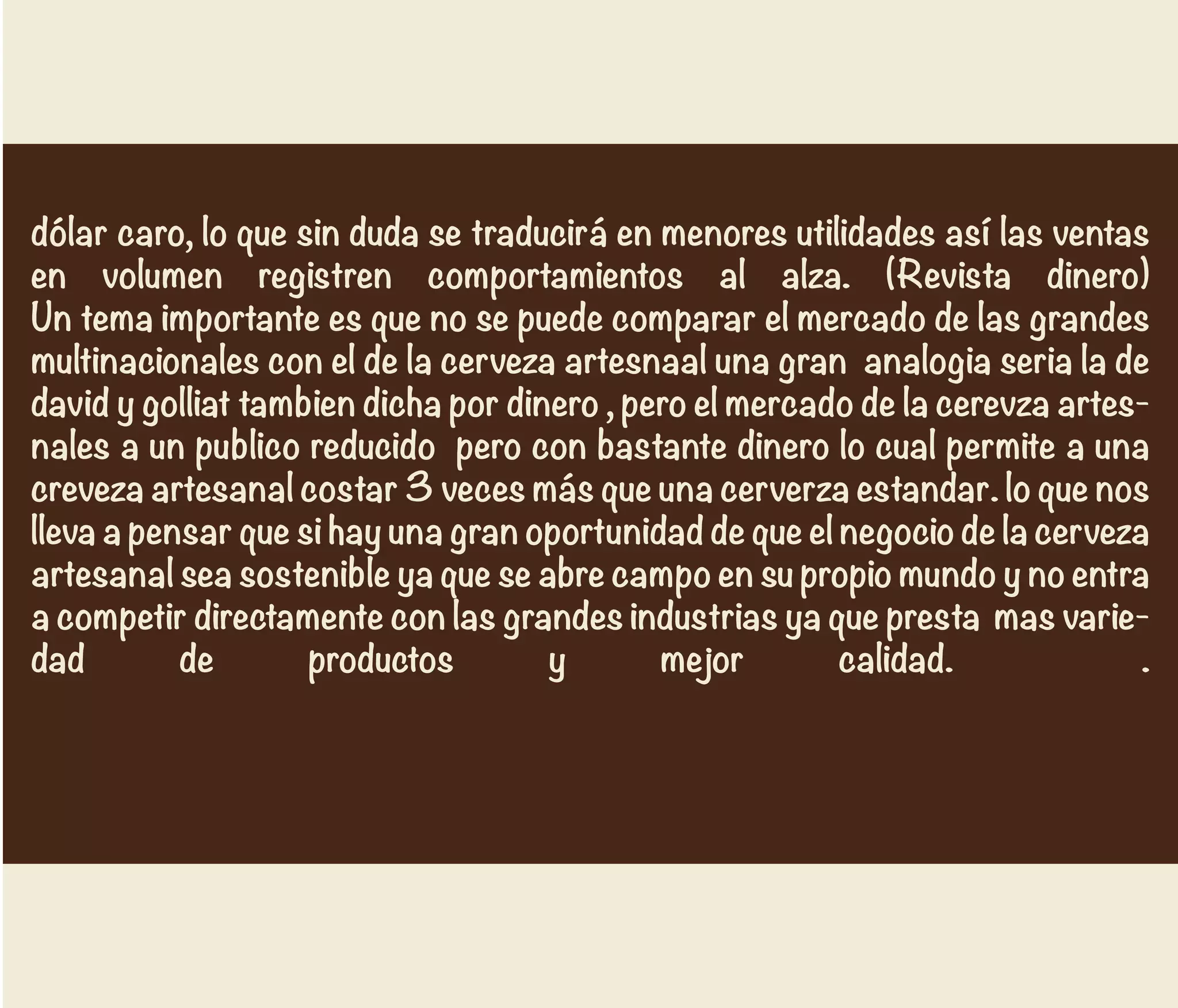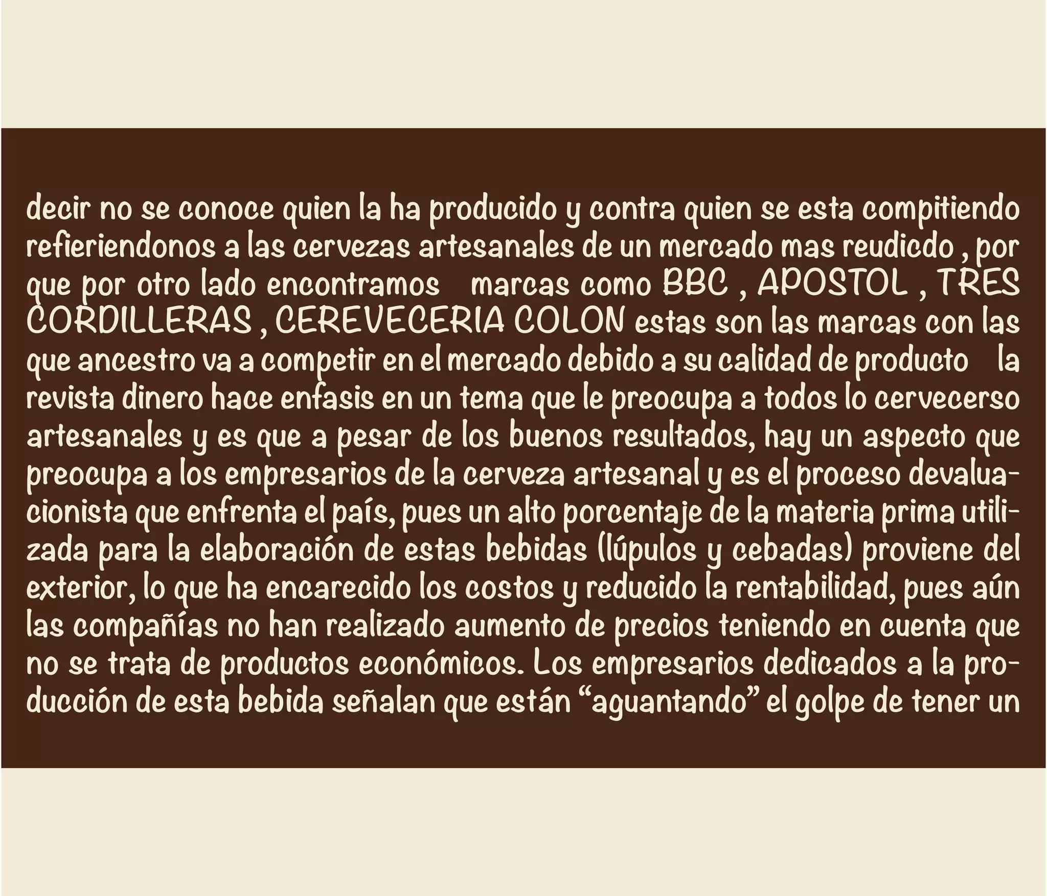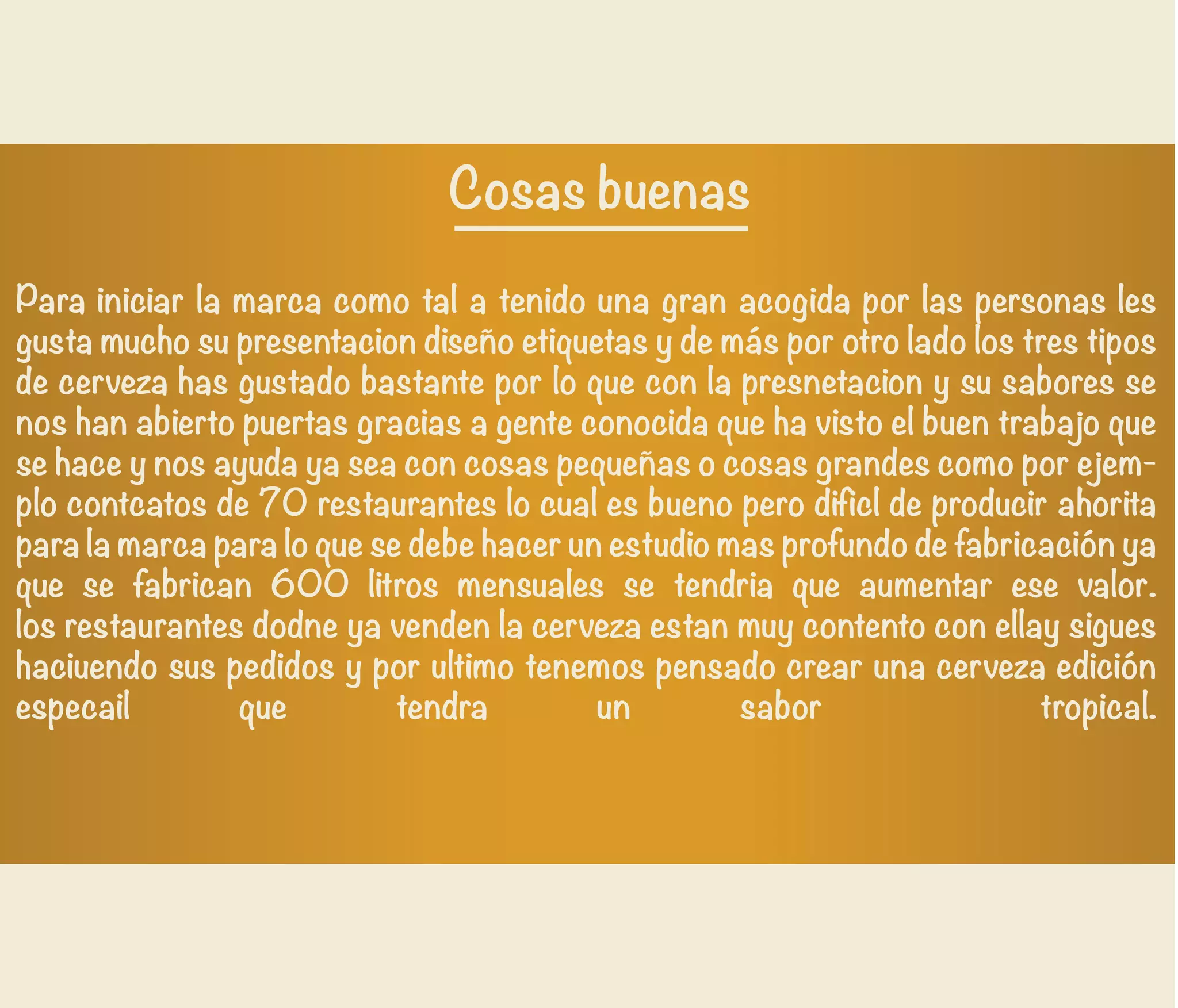La empresa Ancestro planea entrar al mercado de cerveza artesanal con tres tipos de cerveza - una rubia, una roja y una negra - para combinar con comidas en restaurantes frecuentados por clientes de clase media alta. Un cliente entrevistado, el trader Diego Cano de BBVA, probó la cerveza y dijo que cumplió y superó sus expectativas, como se muestra en un video de su entrevista.