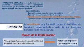 La cristalización es el proceso de formación de partículas sólidas definidas a partir de una disolución, que incluye etapas de nucleación y crecimiento, y se ve influenciada por la sobresaturación. Existen diferentes métodos para clasificar los cristalizadores según cómo se produce la sobresaturación y su aplicación industrial abarca la purificación de sales minerales y la producción de azúcares. Los factores relevantes para la cristalización incluyen la pureza del soluto, el equilibrio y los rendimientos, así como la velocidad de crecimiento de los cristales.