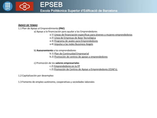 Este documento describe el Plan de Apoyo al Emprendimiento (PAE) con tres líneas principales: 1) Apoyo a la financiación para emprendedores a través de líneas específicas, avales y redes de business angels. 2) Asesoramiento a emprendedores en planes de continuidad empresarial y centros de apoyo. 3) Promoción de valores empresariales en formación profesional y centros de apoyo. El PAE busca facilitar el acceso a financiación y asesoramiento para emprendedores y la transmisión de