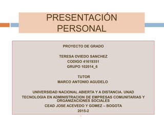 Este documento presenta la propuesta de un proyecto de grado para la Universidad Nacional Abierta y a Distancia. El proyecto se titula "Agrupando mi Gente" y busca generar acciones que concienticen a los habitantes de una comunidad sobre la importancia de su participación en el desarrollo social de su territorio. El documento explica el problema de investigación, los objetivos, la justificación, el marco teórico y metodológico, y el cronograma del proyecto.