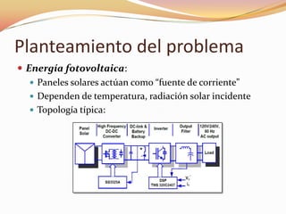 Este documento presenta el proyecto final de un estudiante de ingeniería eléctrica sobre el diseño e implementación de un acondicionador de potencia para generación fotovoltaica. El estudiante selecciona el convertidor puente completo luego de analizar diferentes topologías. El diseño incluye simulaciones del convertidor y su control mediante un DSP. El prototipo implementado incluye un transformador de alta frecuencia y circuitos de aislamiento galvánica.