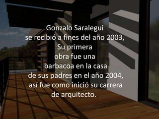 Gonzalo Saralegui se recibió de arquitecto a fines de 2003. Su primera obra fue una barbacoa en la casa de sus padres en 2004, dando inicio a su carrera. Dialoga con los clientes para entender sus necesidades y luego diseña los planos aplicando su estilo racionalista. Un proyecto puede demorar de 2 a 3 semanas en completarse, dependiendo de la urgencia del cliente y el alcance de la obra.