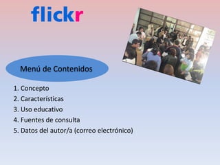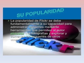 Este documento proporciona información sobre Flickr, un sitio web que permite almacenar, ordenar, buscar, vender y compartir fotografías y videos. Explica que Flickr permite crear cuentas, subir fotos y organizarlas en sets, además de comentar y debatir sobre fotos. También describe cómo Flickr puede usarse para propósitos educativos, como mostrar objetos en clase o crear presentaciones, y resume algunas ventajas y desventajas de usar la plataforma.