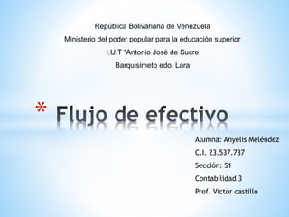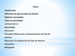 El documento define el flujo de efectivo y explica que muestra las entradas y salidas de efectivo de una empresa por actividades de operación, inversión y financiación. Explica que el flujo de efectivo se usa para tomar decisiones financieras y evaluar la capacidad de una empresa para generar efectivo. También describe los objetivos, tipos de actividades, metodologías, estructura y principios básicos para administrar el flujo de efectivo de una manera efectiva.