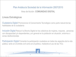 El documento presenta el Plan Andalucía Sociedad de la Información 2007/2010, dirigido a fomentar la inclusión y participación digital en Andalucía a través de los centros Guadalinfo. Se enfoca en la alfabetización digital, la reducción de la brecha digital y el empoderamiento de los ciudadanos, destacando la importancia de los dinamizadores en la conexión entre tecnología y necesidades personales. Además, detalla estrategias para personalizar la formación y promover el autoaprendizaje entre los usuarios.