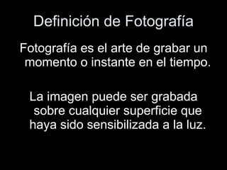 El documento resume la historia y evolución de la fotografía desde sus orígenes en la antigüedad hasta finales del siglo XIX. Se menciona que Aristóteles y científicos árabes como Abd-el-Kamir descubrieron principios fotográficos, y que Leonardo da Vinci y otros artistas usaron la cámara oscura. En el siglo XIX, inventores como Niépce, Daguerre, Fox Talbot y otros perfeccionaron procesos para capturar imágenes fijas. Eastman luego revolucionó