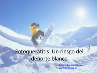 La fotoqueratitis es una afección ocular causada por la sobreexposición a los rayos ultravioleta durante la práctica de deportes de invierno. Los rayos UV se proyectan un 80% más en la nieve y aumentan un 10% cada mil metros de altura, lo que aumenta el riesgo para la vista. La sobreexposición puede dañar la córnea y causar dolor, sensibilidad y disminución de la agudeza visual, e incluso conducir a cataratas precoces u otras complicaciones si no se toman medidas de preven