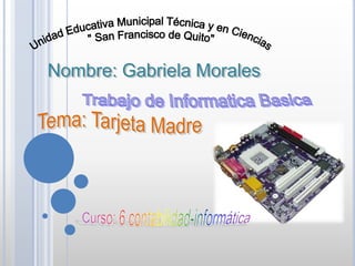 La tarjeta madre es la pieza central de una computadora que contiene el microprocesador, memoria RAM y otros componentes clave. Incluye el bus que transmite datos, zócalos para la CPU y RAM, conectores para periféricos externos e internos, y disipadores de calor para enfriar componentes. Adicionalmente, la tarjeta madre determina qué tipo de procesador y tarjetas de expansión son compatibles.