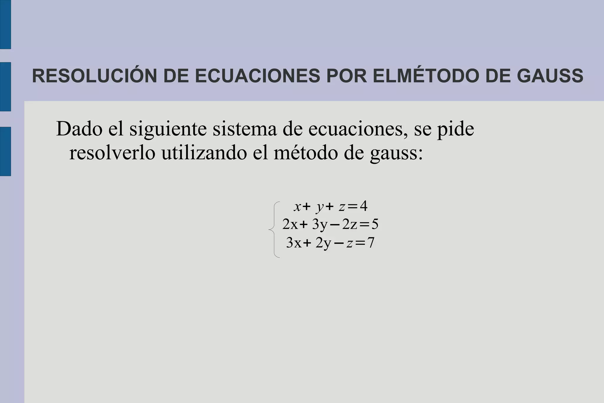 El documento resume los pasos para resolver un sistema de 3 ecuaciones con 3 incógnitas utilizando el método de Gauss. Primero se realizan operaciones sobre las ecuaciones para eliminar las variables de las ecuaciones. Luego se sustituyen los valores obtenidos en las ecuaciones restantes para determinar el valor de cada incógnita. El método resulta en las soluciones x=2, y=1, z=1.