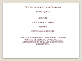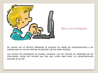 Este documento presenta las reglas básicas de la netiqueta. Define la netiqueta como el conjunto de normas de cortesía para el uso de Internet y redes sociales. Luego enumera 10 reglas básicas como recordar la humanidad de otros, seguir los mismos estándares de comportamiento que en la vida real, respetar el tiempo y ancho de banda de los demás, y excusar los errores de otros. También incluye consejos para cuidar la imagen en Internet como evitar frases ofensivas, errores de ortografía y revisar la inform