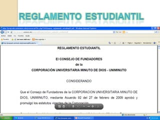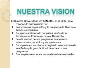 El documento describe el Sistema Universitario UNIMINUTO, el cual ofrece educación superior de alta calidad y fácil acceso para formar profesionales éticos y líderes de transformación social con el fin de construir un país más justo y en paz. El documento también indica que para el 2012, UNIMINUTO será reconocido por sus experiencias espirituales, su contribución al desarrollo a través de la educación, la calidad de sus programas, su impacto en la cobertura a través de sus sedes, y sus relaciones n