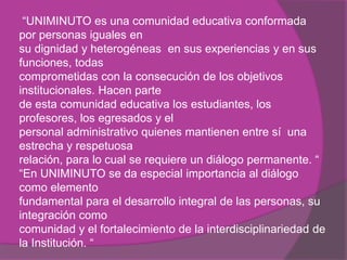 El resumen describe a UNIMINUTO como una comunidad educativa comprometida con lograr sus objetivos institucionales a través del diálogo y la integración de sus miembros, incluyendo estudiantes, profesores y personal administrativo. El documento enfatiza la importancia del diálogo para el desarrollo integral de las personas y la fortaleza de la institución.