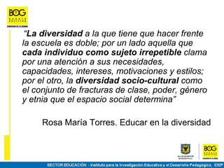 Este documento propone una innovación pedagógica desde una perspectiva intercultural para promover la diversidad cultural en las escuelas. El objetivo es visibilizar, valorar y potenciar esta diversidad para mejorar la calidad educativa. Se presenta una ruta metodológica de seis momentos que incluye la constitución de un equipo de maestros, su capacitación, el diseño e implementación de secuencias didácticas y la documentación y evaluación de los resultados.