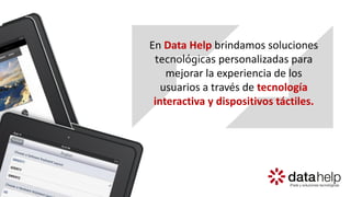 Data Help ofrece soluciones tecnológicas personalizadas que mejoran la experiencia de los usuarios a través de tecnología interactiva y dispositivos táctiles. Proporcionan gestión de eventos, control de acceso, y aplicaciones interactivas, garantizando un acceso ágil y seguro a los participantes. Además, se involucran en el diseño y desarrollo de contenidos, utilizando tecnología de última generación para generar experiencias impactantes.