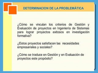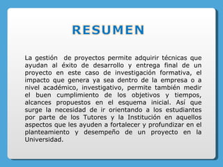 La gestión de proyectos de investigación universitaria permite lograr el éxito en el desarrollo y entrega final de un proyecto mediante el uso de técnicas que ayudan a cumplir los objetivos y plazos propuestos. Es necesario orientar a los estudiantes en aspectos que fortalezcan la planificación y ejecución de sus proyectos. El CIPAS busca involucrar más a tutores y estudiantes compartiendo experiencias que contribuyan a la formación en investigación. La evaluación de proyectos depende de factores como