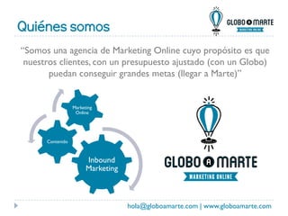 Globoamarte es una agencia de marketing online que busca ayudar a sus clientes a alcanzar grandes objetivos con presupuestos limitados. El equipo está formado por Belén Espino, experta en redes sociales y creación de contenido, y Enrique Muñoz, estratega en marketing digital, ambos con experiencia internacional. Ofrecen servicios como posicionamiento SEO, diseño web, publicidad online y formación en marketing digital.
