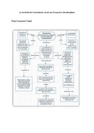 El documento analiza la sociedad del conocimiento desde una perspectiva interdisciplinar, destacando la importancia de la colaboración, la innovación a través de tecnologías y la necesidad de transformar la educación para afrontar los retos contemporáneos. Se enfatiza la formación de profesionales competentes capaces de utilizar nuevos saberes para mejorar la calidad de vida y resolver problemas sociales. Se plantean nuevas formas de educación que rompen con los paradigmas tradicionales, facilitando el acceso y la inclusión en el aprendizaje.