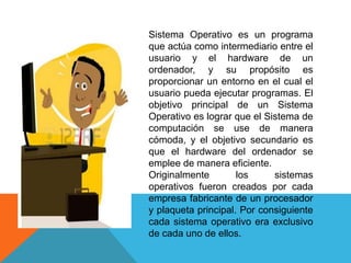 El documento presenta información sobre los sistemas operativos. Explica que un sistema operativo actúa como intermediario entre el usuario y el hardware de una computadora, proporcionando un entorno para ejecutar programas de manera cómoda y eficiente. Originalmente, cada fabricante de procesadores y placas madre creó su propio sistema operativo exclusivo.