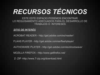 El documento proporciona información sobre los recursos disponibles en el aula virtual, incluyendo enlaces a programas como Acrobat Reader, Flash Player y Mozilla Firefox. También describe cómo los estudiantes pueden acceder a materiales de sus cursos, como guías y videos, y enviar trabajos a los profesores para su calificación. Además, explica cómo usar el correo institucional para acceder al aula virtual y compartir archivos con compañeros de clase usando Google Docs.