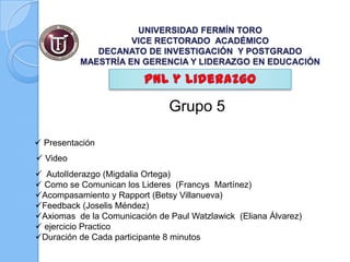 El documento presenta un programa de maestría en gerencia y liderazgo en educación, que aborda temas como autoliderazgo, comunicación efectiva, rapport y feedback. Se mencionan los axiomas de la comunicación según Paul Watzlawick, destacando la importancia de la comunicación como un comportamiento inevitable y su impacto en las relaciones. Además, se ofrecen recomendaciones para lograr el éxito personal y profesional mediante la auto-reflexión y el trabajo colaborativo.
