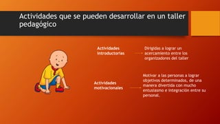 Este documento proporciona información sobre las actividades que se pueden desarrollar en un taller pedagógico. Explica que los talleres incluyen actividades introductorias, motivacionales y de evaluación. También describe las características, objetivos, principios fundamentales y ejemplos de talleres pedagógicos.