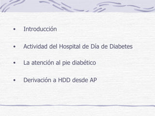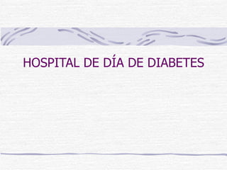 El documento describe las actividades del Hospital de Día de Diabetes. Ofrece atención integral a pacientes diabéticos que requieren un manejo intensivo de forma ambulatoria. Trata debuts de diabetes tipo 1, descompensaciones, pie diabético y embarazadas diabéticas. Ha habido un aumento en la demanda desde atención primaria, especialmente para el pie diabético. Se requiere una definición de criterios de derivación y una mejor coordinación entre niveles asistenciales para el manejo del pie diabético.