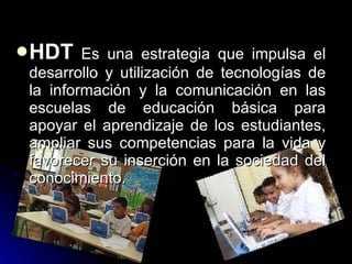 HDT es una estrategia que promueve el uso de tecnologías de la información y comunicación en escuelas primarias para apoyar el aprendizaje de los estudiantes y desarrollar sus habilidades para la vida y la sociedad del conocimiento. Proporciona capacitación para maestros, materiales educativos digitales como planes de clase y objetos de aprendizaje, e infraestructura tecnológica para las escuelas.