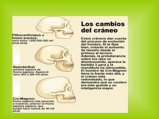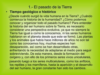 El documento presenta una breve historia de la Tierra y la evolución humana. Explica que la Tierra se formó hace 5 mil millones de años, mientras que los humanos aparecieron hace solo 5 millones de años. A lo largo de la historia de la Tierra ha habido cambios constantes que llevaron al desarrollo de la vida, desde organismos unicelulares hasta los primeros seres humanos. También divide la historia humana en diferentes períodos como el Paleolítico, Neolítico y Edad de los Metales, marcando hit