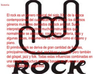 Este documento resume la historia y evolución del género musical rock desde sus orígenes en los años 1950 hasta la actualidad. Detalla los principales artistas y subgéneros que surgieron en cada década, como el rock and roll, el folk rock, el blues rock, el heavy metal, el punk, el new wave, el grunge y más. También describe brevemente algunas bandas emblemáticas como The Beatles, Led Zeppelin, Rammstein, Godsmack y Heroes del Silencio.