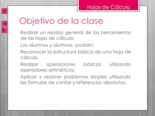 El documento es un repaso de la utilización de hojas de cálculo en MS Excel, enfocándose en la estructura, funciones, y operaciones básicas necesarias para resolver problemas. Se discuten elementos como referencias absolutas, funciones de conteo y fórmulas aritméticas. Además, se incluyen ejercicios prácticos para aplicar los conceptos aprendidos.