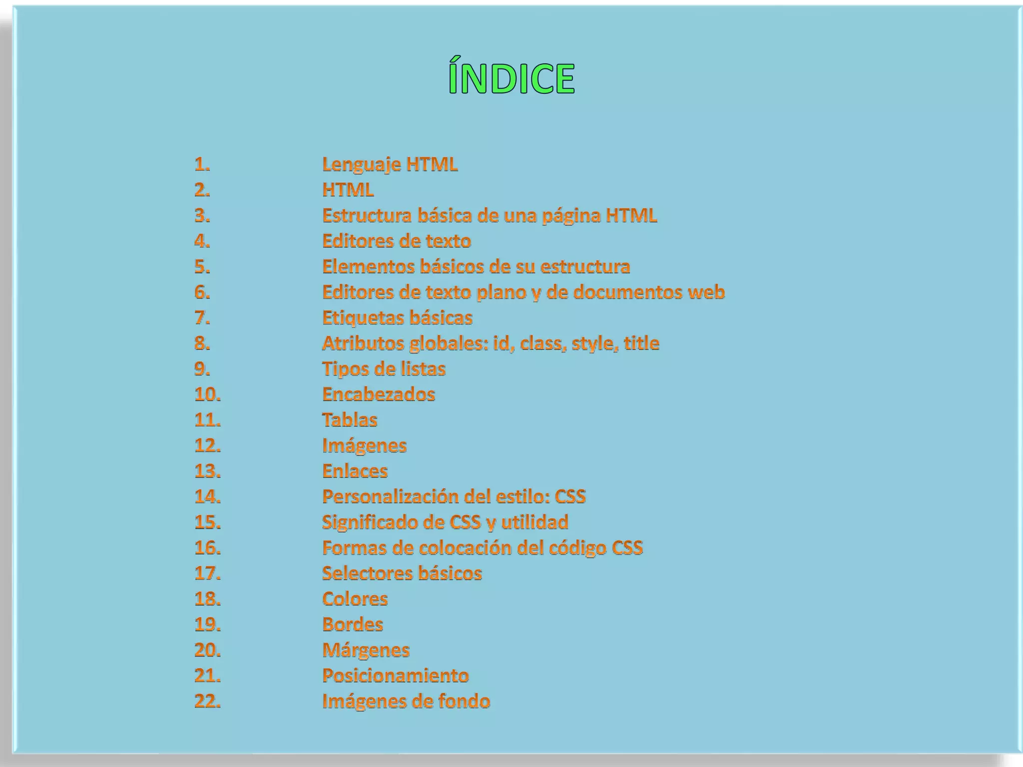 HTML es un lenguaje de marcado que permite presentar información en la web mediante etiquetas. No es un lenguaje de programación, sino que indica al navegador cómo estructurar el contenido junto con CSS y JavaScript. El documento explica las etiquetas, atributos y elementos básicos de HTML como encabezados, listas, tablas, imágenes y enlaces, y cómo utilizar CSS para modificar el estilo y diseño de una página web.