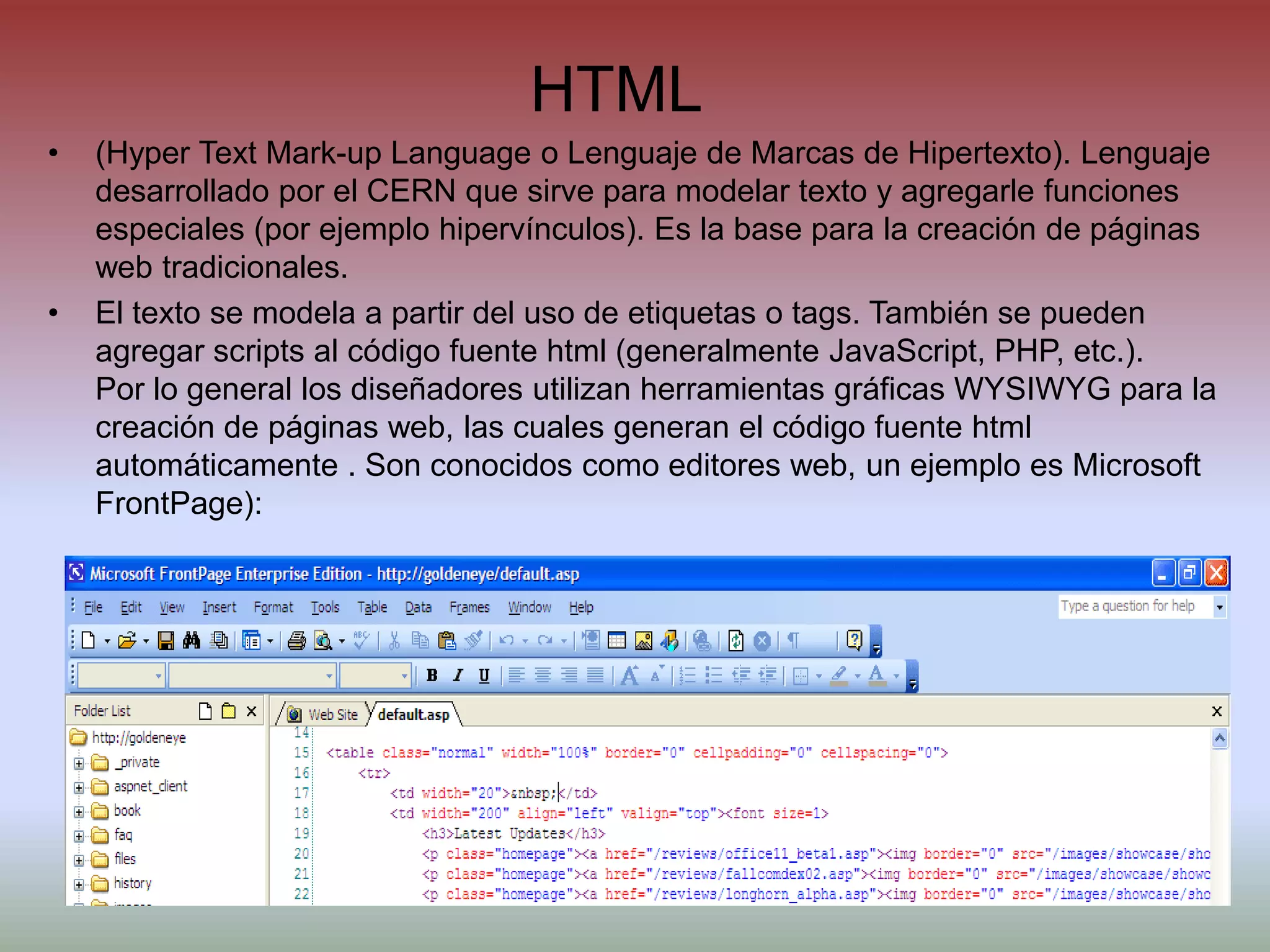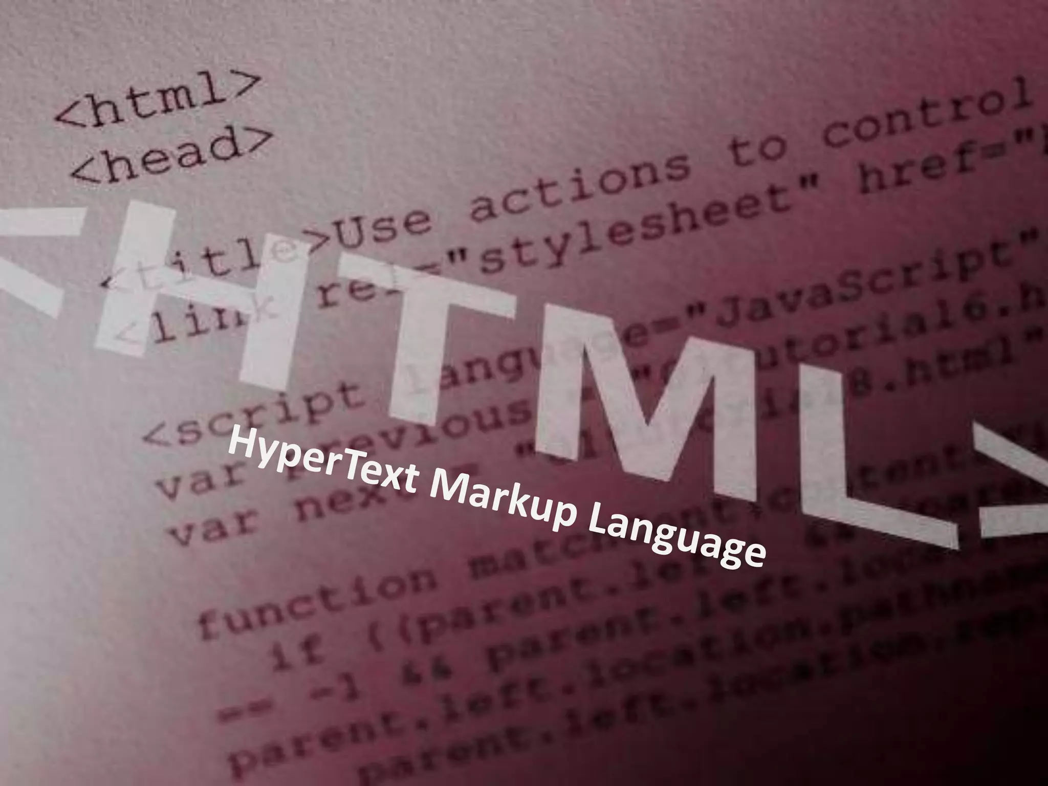 HTML (Hypertext Markup Language) es un lenguaje de marcado utilizado para crear páginas web. Permite agregar etiquetas al texto para darle formato y funciones como hipervínculos. El código HTML se interpreta por los navegadores web para mostrar la página formateada. Las páginas se pueden crear y editar con cualquier editor de texto o herramientas gráficas, y luego subir al servidor web mediante un programa FTP.