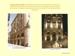 El documento describe la arquitectura modernista-ecléctica de Cartagena y La Unión durante el siglo XIX y principios del siglo XX. Detalla las obras de varios arquitectos como Carlos Mancha, Tomás Rico Valarino, Francisco de Paula Oliver Rolandi, Víctor Beltrí y Lorenzo Ros Costa, incluyendo edificios como la Casa Pedreño, el Gran Hotel, el Casino de Cartagena y las Escuelas de la Sociedad Española de Construcción Naval. También menciona ejemplos del modernismo en La Unión como la Casa del