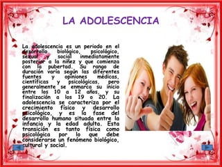 La adolescencia es un periodo de transición entre la niñez y la edad adulta que se caracteriza por el crecimiento físico y desarrollo psicológico. Generalmente comienza entre los 10-12 años y finaliza entre los 19-20 años. La adolescencia implica cambios biológicos, culturales y sociales a medida que los individuos se desarrollan hacia la independencia.