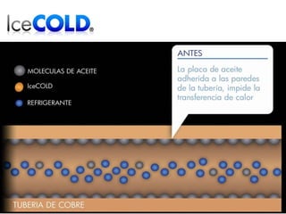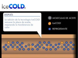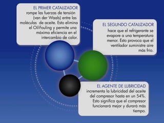 La tecnología utiliza dos catalizadores sintéticos y un agente lubricante para mejorar la eficiencia energética de los sistemas de refrigeración y aire acondicionado al eliminar el fenómeno del "Oil-Fouling" que reduce la transferencia de calor, permitiendo que el refrigerante esté en contacto directo con las paredes metálicas y mejorando la transferencia de calor en un 73%. Esto reduce la temperatura del aire de impulsión en 2-3°C, aumenta la capacidad del sistema y su vida útil, y
