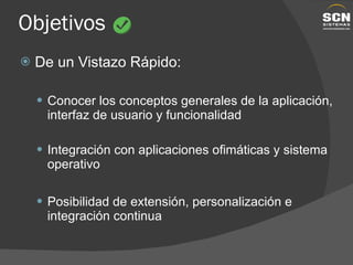 El documento describe una aplicación de gestión documental llamada I+Doc. Ofrece funcionalidades como búsqueda de información, almacenamiento electrónico de documentos, control de acceso por roles de usuario, y posibilidad de extensión e integración con otras aplicaciones. La interfaz es amigable y se puede personalizar. La aplicación permite clasificar, organizar y buscar documentos de manera flexible.