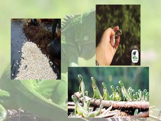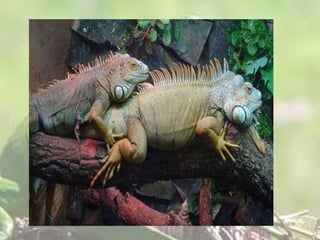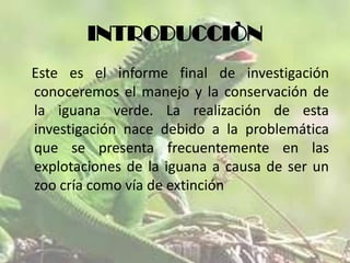 Este documento presenta las condiciones necesarias para el manejo y explotación de la iguana verde. Explica que la iguana se alimenta principalmente de hojas y frutos de árboles y arbustos. Su reproducción involucra cortejo, apareamiento y puesta de huevos en madrigueras excavadas por las hembras. También cubre su hábitat, enfermedades comunes y el marco legal para la cría y conservación de esta especie en peligro de extinción.