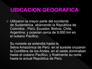 El Imperio Inca se extendió por gran parte de Sudamérica occidental, desde Colombia hasta Chile y Argentina, con acceso al Océano Pacífico. La sociedad inca era jerárquica y rígida, con el Inca en la cima y el pueblo en la base. Los incas desarrollaron una arquitectura pública funcional con calles y plazas. Adoraban al Sol y consideraban a los emperadores como descendientes divinos. Su economía se basaba principalmente en la agricultura de cultivos como la papa y el maíz.
