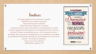Este documento trata sobre la inclusión educativa. Define la inclusión como un proceso para identificar y responder a las necesidades de todos los estudiantes mediante una mayor participación y reduciendo la exclusión. Explica las diferencias entre integración e inclusión y describe algunas actuaciones de éxito para la inclusión de estudiantes con discapacidad como agrupaciones heterogéneas y la participación de la comunidad y familias.