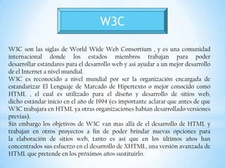 W3C es el organismo internacional encargado de establecer los estándares web como HTML y XHTML. Su objetivo es garantizar la accesibilidad de la web para todos, extenderla a nuevos dispositivos y asegurar su seguridad y privacidad. W3C juega un papel fundamental en el desarrollo continuo de la web a nivel mundial.